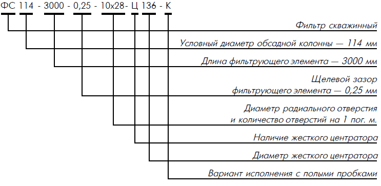 Пример условного обозначения фильтра скважинного с полыми пробками при его заказе для обсадной колонны диаметром 114 мм с щелевым зазором 0,25 мм и длиной фильтрующего элемента 3000 мм, оснащенного жестким центратором диаметром 136 мм: