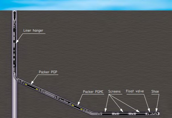 For well casing with collar cementing liner with additional isolation of upper zones by inflatable packers the following